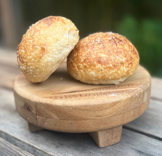 Potato Dinner Rolls are made with local Cairnsprings Flour, this light wheat dough is naturally leavened, and has great flavor from local organic russet potatoes in it. Our Potato Dinner Rolls are rough cut, with a thin crispy crust, perfect for your holiday meal or leftover turkey sandwich! Each roll is ~2oz / 8 per pk