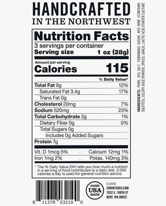 INGREDIENTS: Pork, Sea Salt, Turbinado Sugar, Red Wine, Celery Juice Powder, Spices, Garlic, Lactic Acid starter